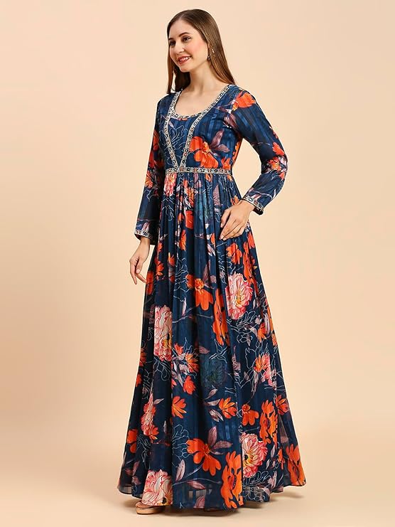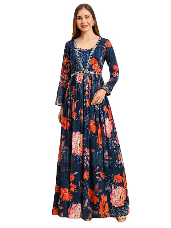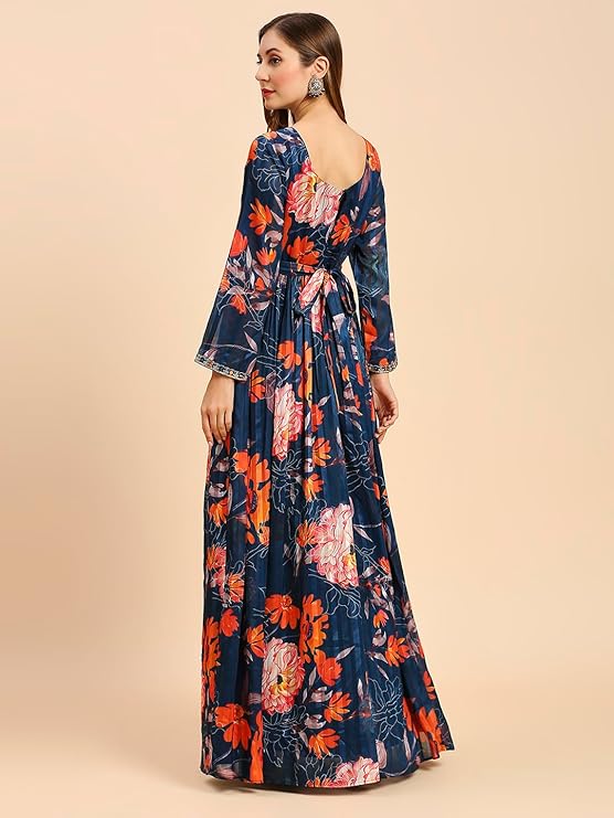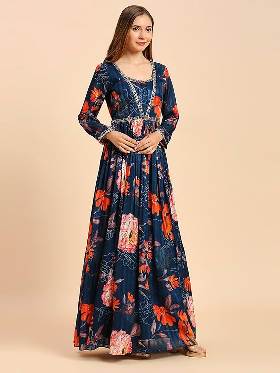 Madhuram Women’s Sartin Patta Gown for Women Ethnic with Digital Print and Embroidery Work Long Gown(M-2463)